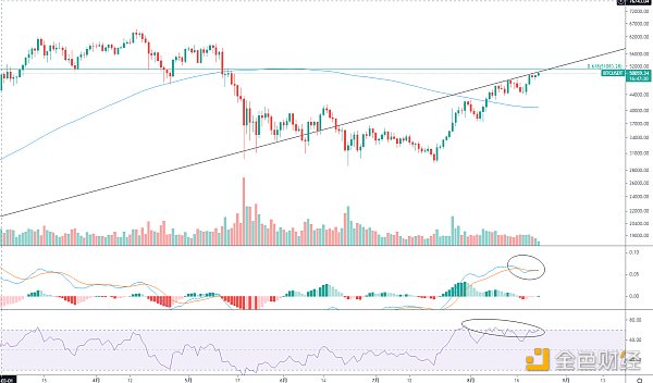 BTC突破5万美金,再创反弹新高,不过还是背离式拉升,量价和指标不是很健康,这样下去后面容易引发调整,上方压制线为去年312大跌低点起涨趋势线,可以看到近期反弹沿着趋势线向上,不过一直未能有效突破,上方也接近前期大跌的0.618位置51100附近,所以这一共振压力带要注意,有效突破新的空间才能打开,后续压力53000和55000美金,下方日线级别支撑为这一轮反弹上行趋势线,不破可以继续持有,一旦破位,那么后面回踩120日均线的概率将加大,中长线或将又是一次较好的低吸机会。