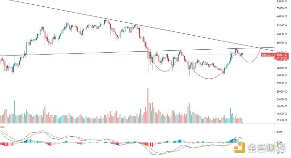 自519大跌到目前技术图形看,整体走势有酝酿头肩底的迹象,潜在左肩和中间大底已形成,目前差的就是右肩部分,只要后面有效突破上方颈线压制,那么这个形态就确立了,这个头肩底一旦形成,那么后面突破前顶64850美金回落的下降趋势线是很简单的事,那么从4月中旬见顶后到目前的中期弱势行情反转的概率就大了。