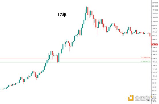 17年牛市行情中期也有类似大调整,可以发现这波大调整最低也未破0.382支撑线,和13年大调整的区别,这波调整回撤至该支撑线然后快速向上反弹,周线大阳线反包前期阴线,后续继续拉升收复失地再创新高,牛市后半段还有更疯狂的行情。