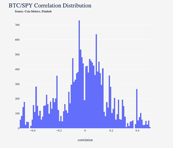 股票市场庞大而复杂,可能很难分析比特币与整个股票市场的真实关联。检验与股票相关性的一种相对简单的方法是查看比特币与S&P 500指数(特别是SPY)的相关性,它可以作为整个股市的代理。