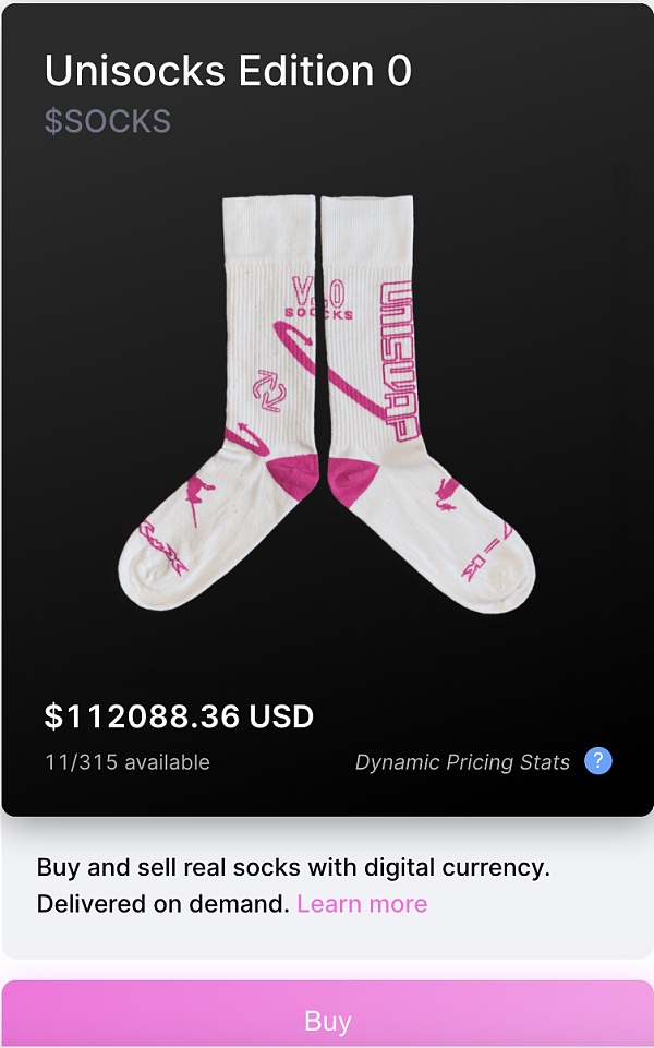 2019年,V1发布的时候,Uniswap 创建了 500 枚 SOCKS 代币,他们最初的想法是,SOCK 代币将由相同数量的限量版、实物袜子作为“支撑”,最初 SOCKS 代币价格为12 美元。