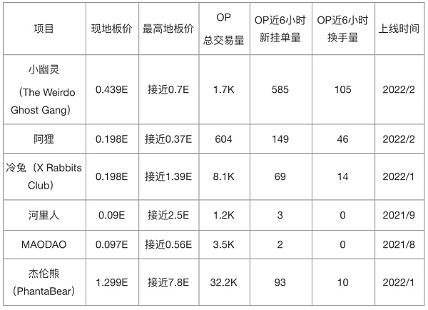 我们查看了几个知名度非常高的NFT项目,他们是近期太火的小幽灵、阿狸,以及上线更早的冷兔、河里人和Maodao,以及曾经非常火爆的杰伦熊。它们或许不能代表整个中文NFT项目的全部,但至少也是一个缩影。