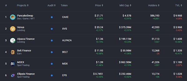 币安链上所有DeFi项目的信息包括TVL、市值、用户、代币价格等,可供排序。