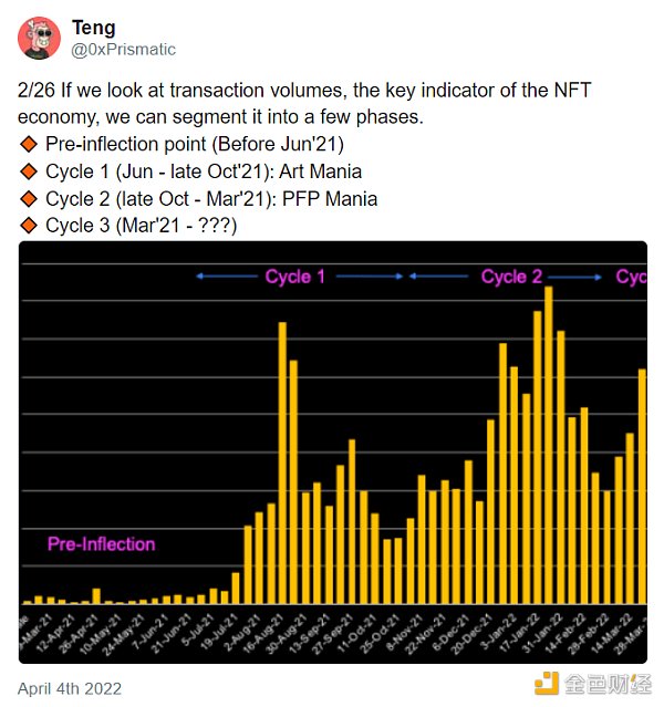 如果我们看一下交易量,即 NFT 经济的关键指标,我们可以把它分成几个阶段: