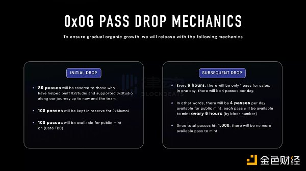 0xOG PASS 采用一种 Two-Step Drop 的发售方式,发售价格为 1.8 ETH,在初始阶段仅流通 280 个(100 个公售,80 个空投给 0xStudio 的早期支持者,100 个保留给未来能与 0xStudio 一起 BUIDL 的 0xAlumni),其余的 720 个将在后续阶段售出,每 6 小时将有一个 0xOG PASS 可供铸造,直至 1000 个 PASS 完全被铸造完。