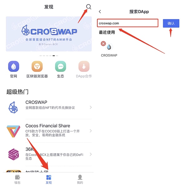 下载并注册成功后进入CocosWallet点击最下方“发现”;然后点击上方搜索框输入地址:croswap.com,然后点击“确认”即可进入CROSWAP。(如下图所示)