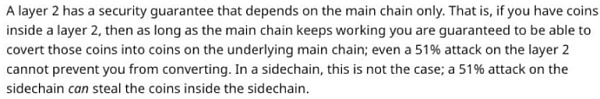 所以切换到其他L1网络,就会有以牺牲资产的安全性或去中心化为代价的风险,看看V神是怎么说的: