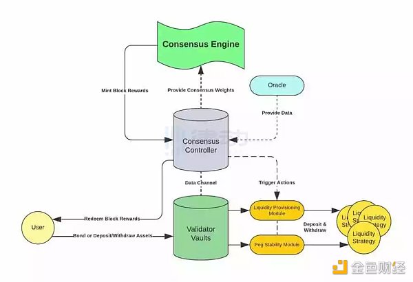 用户将各种资产存入共识保险库系统中,从而获得代表其存款的 Token 化份额(类似于旨在统一 DeFi 收益标准的 ERC-4626),这些 Token 化份额将用于治理,用户也可将自己的存款委托给特定的验证者,从而将共识投票权分配给他们选择的验证者 (类似于 DPOS 委托权益证明系统)。