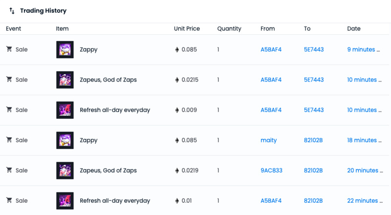 以该系列 NFT 中最有稀有的 Zappy(仅活动满级用户才可领取)为例,短短一周之内(自 8 月 19 日起),该卡的价格已从 0.025 ETH 涨至 0.085 ETH,虽然受总供应量较大影响(Zappy 共 1.44 万张),该卡的价格相较于当前大火的各种头像仍显得很低,但这一涨幅却是切切实实存在的。与价格同步上扬的还有成交量,从 OpenSea 历史数据可以看到,一周之前,该卡每日的成交量基本都保持在个位数,但进入本周以来,该卡每日的成交笔数都能达到数十张,甚至上百张。