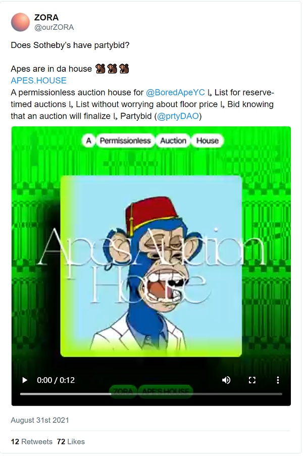 Zora推出了APES.HOUSE,这是BAYC的一个无权限拍卖行系统。