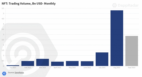 2021年,NFT市场已经产生了超过100亿美元的交易量。在五到六个月的时间里,无数的NFT项目被推出,推动该空间在8月创下了记录。在那个月,NFTs交易产生了超过52亿美元,吸引了超过314万名交易者。交易量比7月份增加了311%,比3月份增加了680%。