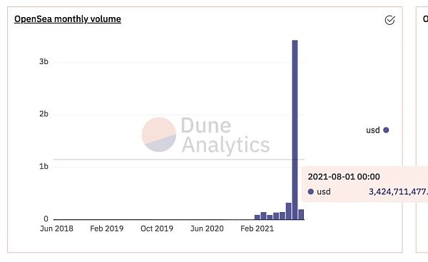 在同一时期内,它们的月营业额从大约90万美元增长到了32亿美元。这样的增长有助于以太坊和NFT领域获得进一步的采用,但另一方面,这也导致个人以gas战争的形式争夺NFT。