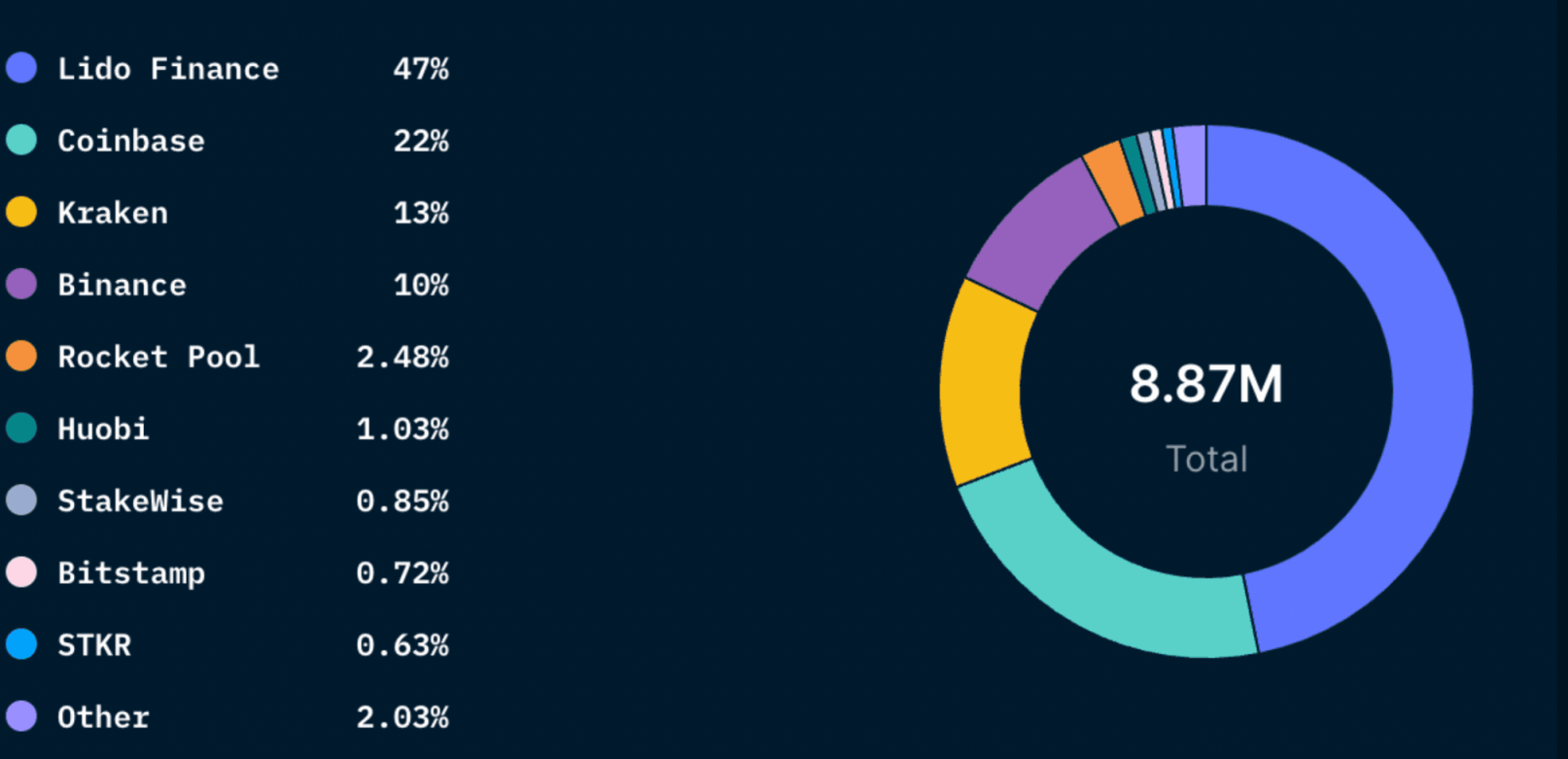 Lido 是一个由 LDO 代币管理的去中心化 DAO 组织,它的设置方式允许多个验证节点。 虽然这种结构显然更难成为监管机构的目标,但一些人对代币所有权的集中化提出了担忧。 这可能会使 Lido 易受攻击并使其面临中心化风险。