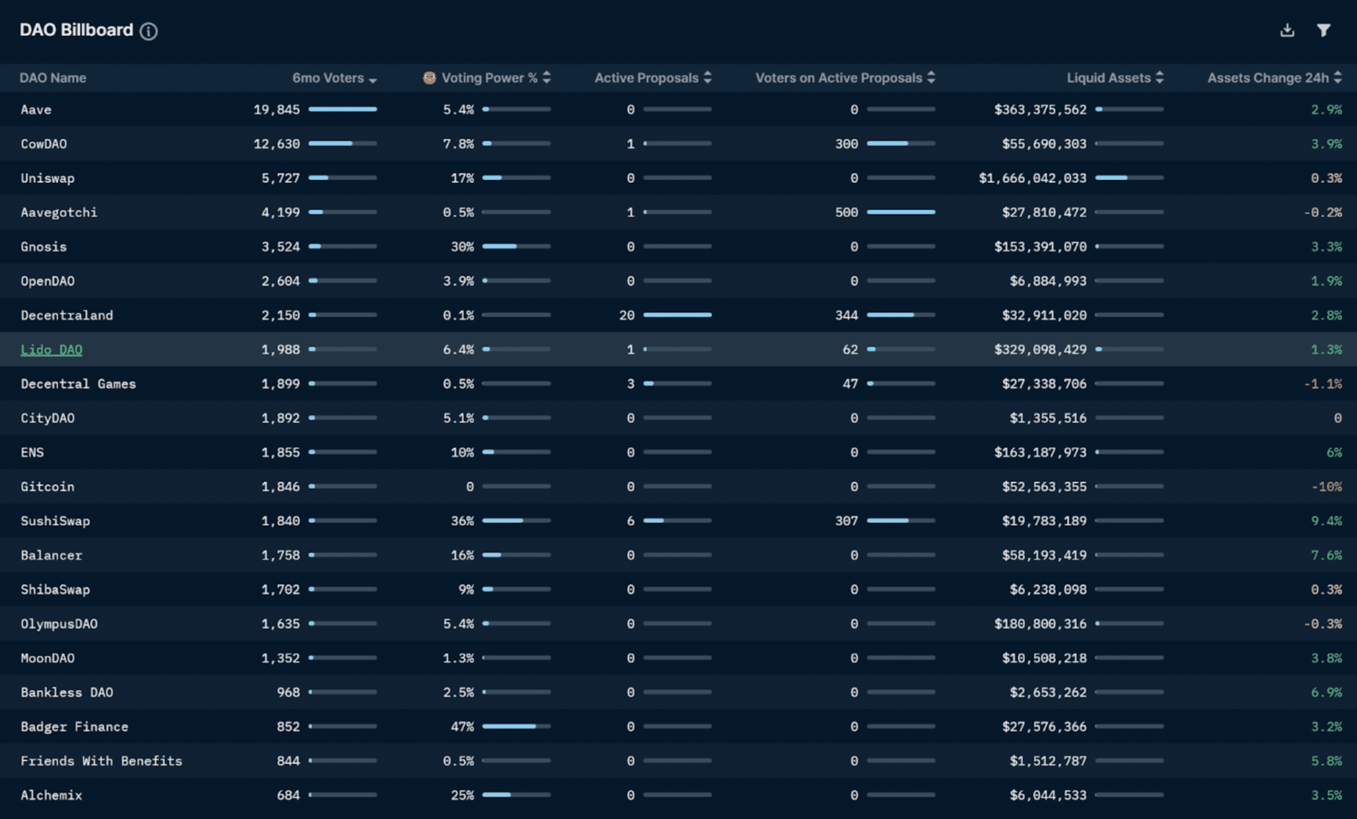 下表给出了过去 6 个月所有 DAO 的核心治理参与统计数据。 Lido 拥有 1988 个独特的钱包,他们在过去 6 个月内对任何提案进行了投票,使 DAO 成为该领域最活跃的 DAO 之一(第 8 位)。 然而,与领先排名的 Aave 的 19845 名独特的钱包参与者相比,这个数字相形见绌。 然而,参与治理的钱包数量并不能真实反映去中心化治理的程度,因为投票权与钱包持有的代币数量有关,而不是在 1 个钱包 1 票的基础上。