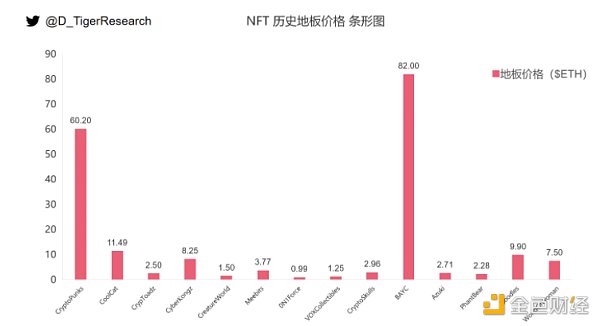 图4-2 15种NFT的历史最低价格($ETH)条形图,截至2022-01-19