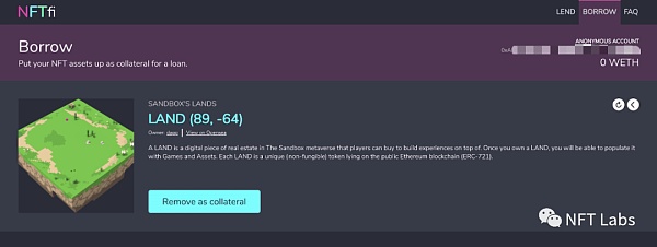 然后资产就可以发布在 NFTfi 借贷市场上,作为抵押品获得贷款(下图以 The Sandbox 地块为例)。