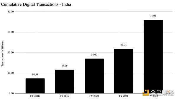 数字银行颠覆了包容性的单位经济。突然间,银行不再需要在世界的偏远地区设立办事处。相反,他们可以通过移动设备的连接,接触到他们的用户,进行必要的 KYC 并提供银行服务。这方面在印度表现得最为明显。该地区一个名为 UPI 的国有支付网络在四年内从每月 40 亿美元的交易量扩展到超过 1200 亿美元的交易量,印度人每年通过数字方式进行 720 亿次交易。
