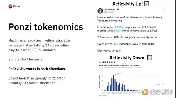 Richard 在旁氏模型这部分主要通过 Axie Infinity 来阐述了 Reflexivity works in both directions,即反身性是双向的。不能看着一只向上走的旁氏数据图像,就以为它达到了产品与市场的契合点。