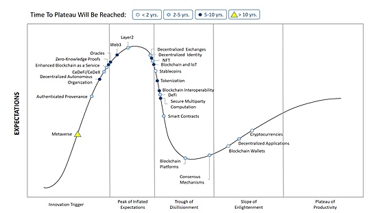 早期投资必须思考未来,我们最常听到的一句话是未来已来,但到底未来是什么?未来会如何?确实难以判断预测。但是思考未来是一个必须经常提醒自己去做的事,想想下一年如何如何,5年后又如何如何,10年后呢?这个社会,经济,技术发展,商业应用,环境,甚至自己的生活可能有什么样的变化。思考未来是投资人与创业者所必须时常思考的事。近几年热门的话题无非是Web3, DAO, 元宇宙等非常未来已来的话题。我们看看2022年7月份 Gartner 发布的对于区块链这个生态业态的一个细分领域的生命周期的一个预判,其中元宇宙从早期采用者到产业成熟期还要10年以上的时间,而DAO以及Web3 则是还需要5-10年的时间。从早期投资的角度而言,现在就是投资人开始布局介入,创业者开始思考的时机。