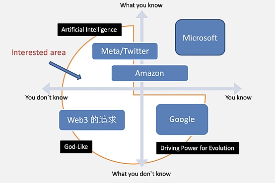 最后, Web3塑造未来,核心逻辑是去中心化,在实际场景体现出来就是用户自主,但是把思路再开点脑洞,或许Web3是在追求我们所不知道的不知道的领域。传统上你知道你所知道的就是所谓的知识,你知道你不知道的,那可以用Web2的百度,谷歌去查询。你不知道你知道的,也没关系,Web2里的亚马逊,脸书可以依靠人工智能帮你知道。再来就是你不知道你不知道的,可能Web3的机会就在这里。期待与大家一起共创未来。
