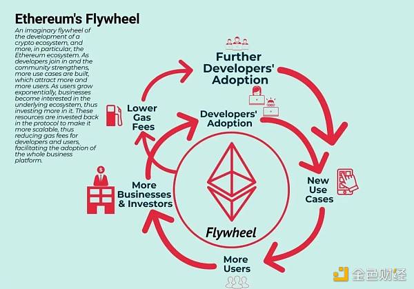 飞轮效应:以太坊的经济模型同样有很好的理论基础,可以激励各个参与者进入正循环。当两个飞轮都在转动时,Ethereum的激励方式是token,而Amazon是现金,因此他的飞轮更有即时性和爆发力。