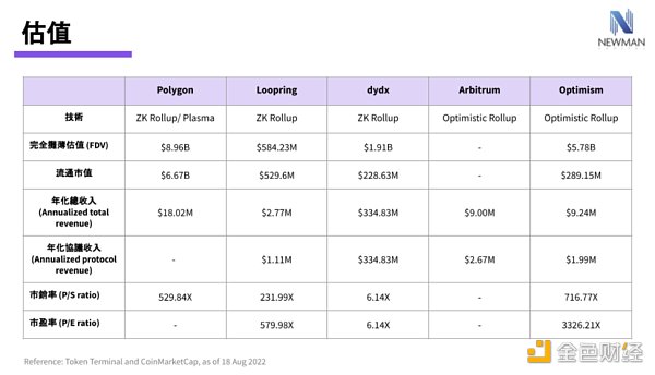 估值:在我们的研究中,我们比较了领先的 L2 公司的关键估值指标,发现 Polygon 在多个环节的表现都优于其同行,包括市值、收入和市销率(P/S)。 截至 8 月 18 日,Polygon 的完全摊薄估值(FDV)是 Polygon 的首要竞争对手 Optimism 的 1.55 倍。此外,Polygon 的年化收入相当于 Aribtrum 和 Optimism 的总和,Polygon 和 Loopring 的 P/S 比率分别为 529.84 和 231.99,这意味著投资者认为在收取相同数量的收入时,Polygon 的价值大约是 Loopring 的 3 倍。