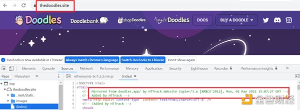 查看源代码,发现这个钓鱼网站直接使用 HTTrack 工具克隆 c-01nft.io 站点(真实网站)。对比两个站点的代码,发现了钓鱼网站多了以下内容: