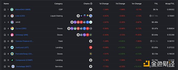 DeFi项目锁定资产前十排名及锁仓量 数据来源:defillama