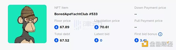 8 月 18 日,BAYC 的地板价下跌至 72 ETH 左右,而此前曾在 BendDAO 上抵押借贷的 BAYC#533 的有利息债务为 66.97 ETH。