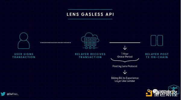该API允许用户简单地签署一条消息(例如,作为一条评论),然后中继者接收这条消息与相关的信息,将数据上链,完成交易。对于中继者来说,这种方法稍微有点耗gas费,因为他们必须验证签名,然后在链上发布数据。然而,它让用户体验更有趣和满意。应用层平台需要支付gas费,这意味着Lenster或LensFrens有义务支付这些费用。虽然使用无gas费API的缺点是,用户依赖中继者在链上发布交易,而不是自己完成交易,但考虑到社交媒体发布不需要与金融交易相同的安全级别,这种权衡是值得的。此外,中继器也增加了灵活性,有一个小时的宽限期,可以在链上正式发布交易,他们可以避免高gas费用的时期。
