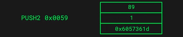 PUSH2 将 2 字节的十六进制数据 0x003b,十进制值为 59,推送到调用栈中。