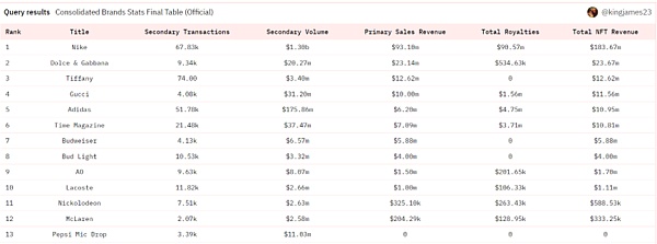事实上,自2022年以来,主动拥抱NFT的传统品牌越来越多,已有品牌从NFT中获得了不错的收入。Dune Analytics平台的用户kingjames23tong统计的数据显示,运动品牌耐克(Nike)的NFT已经为公司创造了超过1.85亿美元的收入。在基于以太坊发行NFT藏品的传统品牌中,耐克成为NFT销冠,Tiffany、Gucci和Adidas等品牌位列其后,通过NFT项目获得了1000万美元-2000万美元的收入。