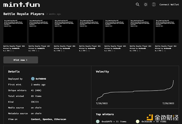 2022年7月,Andy Chorlian发布了Battle Royale,这是一款链上PVP游戏。Battle Royale是一个简单的项目,Chorlian只是简单地将游戏的智能合约丢入到mint.fun中,为玩家创造一个有趣的铸造UI。瞧!这样游戏就可以很快开始了。