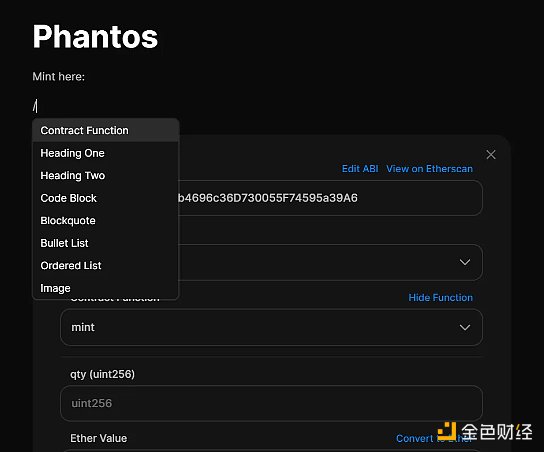 Midwit的使用方法非常简单。假设你正在使用Mirror文本编辑器编写铸造公告。按回车键另起一行,按“/”键,然后选择“Contract Function”(合约功能)选项。