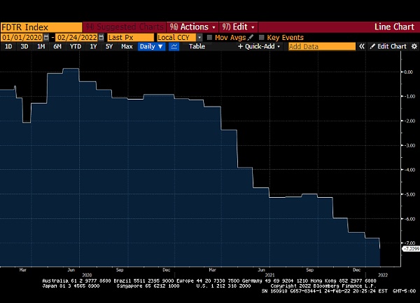 如果我们看一下欧洲美元期货曲线,它将在明年 9 月达到接近 2.5% 的峰值。市场预计美联储将提高短期利率,因为这类期货的基准是期限三个月的美元存款利率。2.5% 不足以对抗当前的通胀水平,这还没有考虑到各种中型或大型冲突,这些冲突将在未来 12 个月内完全扭曲全球能源使用。
