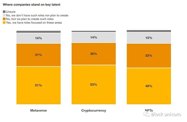 公司也在推进相关的组织变革,32%的公司计划雇佣或任命一名 “ 元宇宙领导者 ”,51%的公司已经指定了专注于元宇宙活动的职位(即使不总是专门的),类似的数字职位也集中在加密货币或NFT上,这些职位的崛起是令人鼓舞的,但真正的元宇宙价值需要的不仅仅是把责任分配给一个有技术,有远见的人,你需要将技能、技术和内部流程结合起来,完善整个结构,以实现元宇宙业务成果。