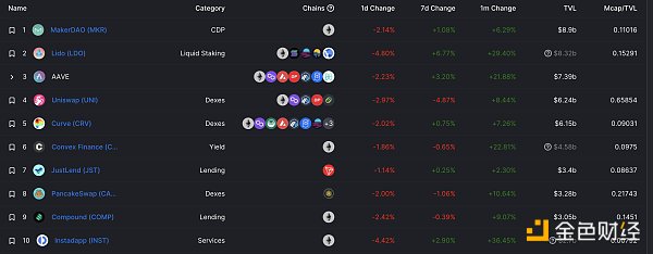 DeFi项目锁定资产前十排名及锁仓量 数据来源:defillama
