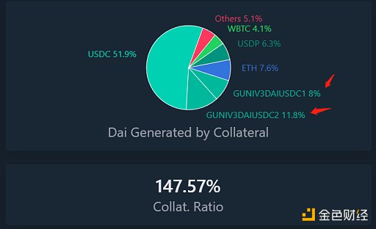 而 MakerDAO 的 DAI 铸造中,有 19.8% 的 DAI 来自于 G-UNI 的抵押物。