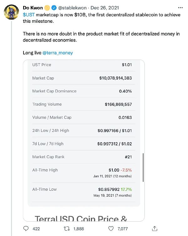 Do Kwon促进了 UST 的增长,UST 是一种由补贴奖励推动的算法稳定币,后来在 2022 年初崩溃,曾达到 20B 美元的峰值。