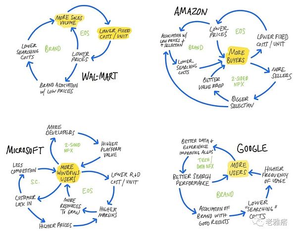 亚马逊作为一个独立的平台,其电子商务量比Shopify店面要大。Steam所获得的收入比单个游戏工作室还要多。为什么?归根结底是客户选择了具有最大选择性和最小摩擦的商店。选择的数量越多,商业活动集中于某一途径的可能性就越大,从而使平台更容易提供更多的选择,同时由于经营规模而保持成本低廉,这就是现代商业的飞轮效应,Max Olson不久前在Twitter上对这些工作做了一个很好的可视化。