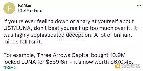 而三箭、Galaxy Digital、Jump Trading 等 VC 和做市商,则选择性地忽视了 Luna 的强金融属性,将被 Anchor 独霸的 Terra 生态放入公链叙事,与 Solana、Avalanche 等生态并驾齐驱,不断鼓吹「Solunavax」。据 Terra 研究论坛成员 FatMan 表示,三箭曾以 5.596 亿美元的价格购买了 1090 万枚 LUNA。现在,它们只值 670.45 美元。