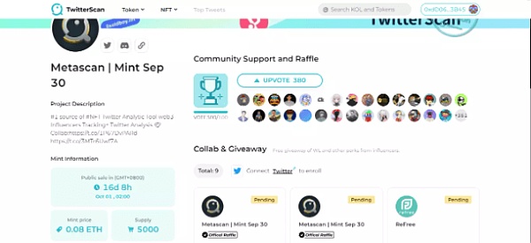 项目鲸鱼关注度查询网站:TwitterScan。用于新项目的研究,项目鲸鱼关注量越高,项目后期发展潜力越大。