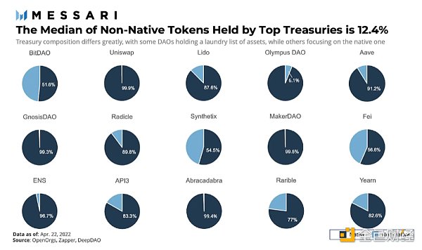 Autonolas的一份报告(2022年5月)披露了关于国库多样化和资本效率的一个值得注意的趋势:原生代币构成了大部分的持有量,但只有一小部分在使用。在这份研究报告中,65个国库超过1000万美元的DAO中(在本文发表时为61个,2022年10月),40个DAO的单一资产占国库总价值的80%以上。