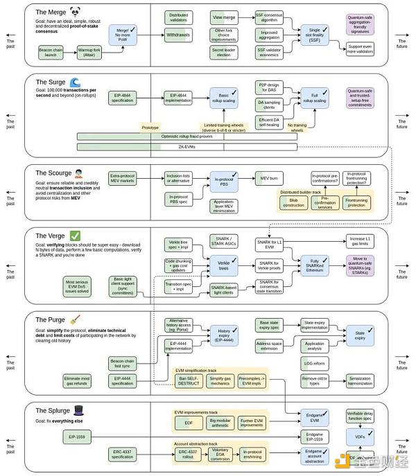 该路线的主要目标是构建去中心化、健壮简洁的 PoS 共识机制。以太坊目前已经成功切换为 PoS,接下来主要是针对网络验证者安全以及零星功能的修修补补: