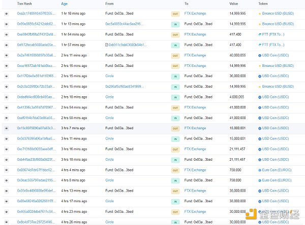 在Coindesk调查出现后,Alameda就开始从Circle处调集USDC向FTX充值。 Etherscan数据显示过去3天内,Alameda地址(0x83a127952d266a6ea306c40ac62a4a70668fe3bd)向FTX充值约5.6亿美元,其中主要来自Circle处。