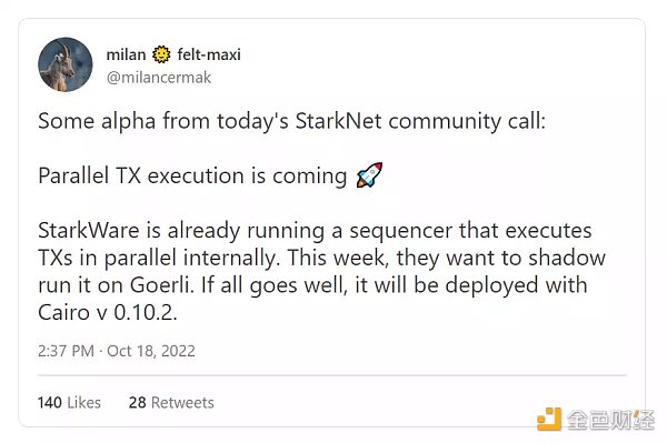 在 starknet 社区中,成员也提出了 aptos 的并行处理方式非常不错。就 Starknet 而言,目前也在推进排序器内部 tx 并行排序的能力。