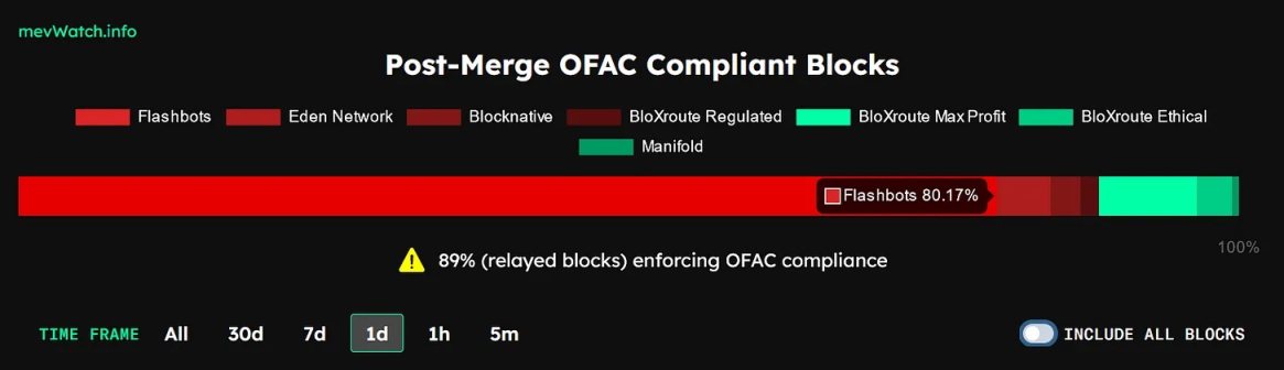资料来源:Devcon审查威胁但是如果中继者自己选择审查呢?这将我们带到了中继者级别的中心化风险的核心。今天,以太坊上 58% 的中继区块都在审查 Tornado Cash 交易,即符合 OFAC 标准。这 58% 区块中的大部分(80%)来自 Flashbots 的中继器(见下图)。