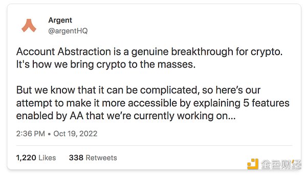 帐户抽象(AA)将改变人们进入 crypto 以及进行交易的方式。StarkNet 以及 zkSync 都支持了它。下面的帖子解释了帐户抽象(AA)的力量。TLDR:更好的用户体验,更高的安全性,更大的灵活性,等等。助记词短语将成为过去时。