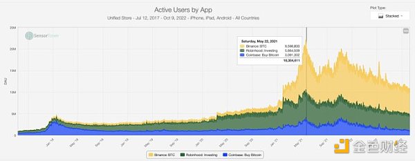 最后,我介绍了一些关于移动应用程序的数据——以及它们与传统变体的比较。下图查看了 coinbase、Binance 和 Robinhood 的 DAU。在鼎盛时期,Binance 的 DAU 几乎是 Robinhood 的两倍(尽管它是一款全球应用程序)。