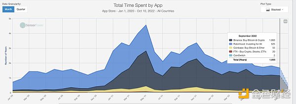 价格下降并没有真正转化为花在这些应用程序上的时间大幅下降。在鼎盛时期——币安每个月在该应用程序上花费的时间接近 1800 年。这个数字现在下降到约 1063 年,人们仍然喜欢代币。